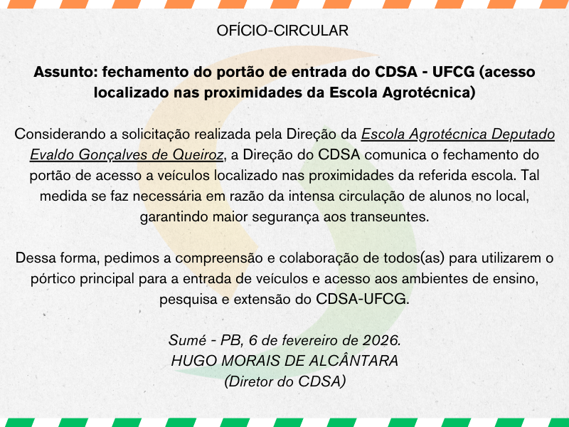 Assunto: fechamento do portão de entrada do CDSA - UFCG (acesso localizado nas proximidades da Escola Agrotécnica) Considerando a solicitação realizada pela Direção da Escola...