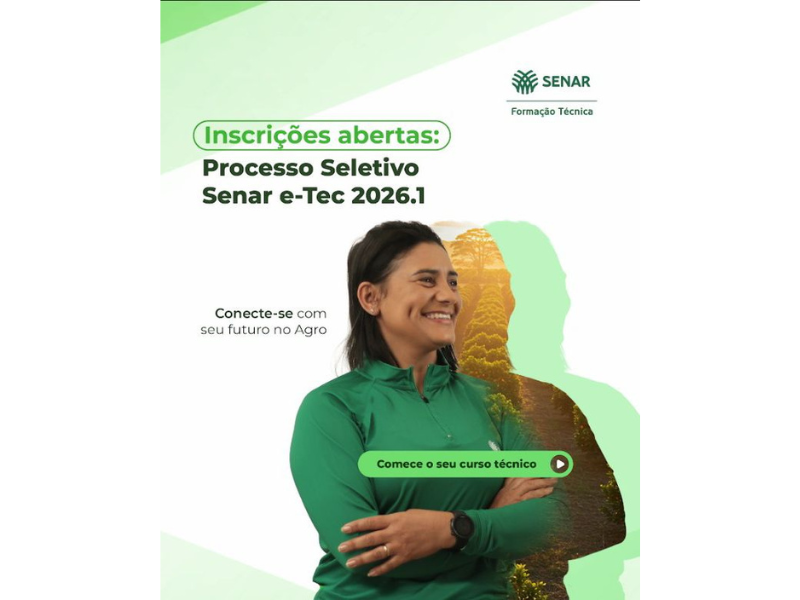 Começaram as Inscrições para o Senar e-Tec 2026.1 — Garanta sua Vaga! O Serviço Nacional de Aprendizagem Rural (Senar) está com inscrições abertas para o Processo Seletivo do programa e-Tec 2026.1, oferecendo cursos técnicos gratuitos nas áreas de Zootecnia e Agropecuária. A iniciativa é uma excelente oportunidade para quem deseja se qualificar profissionalmente e ingressar com mais...