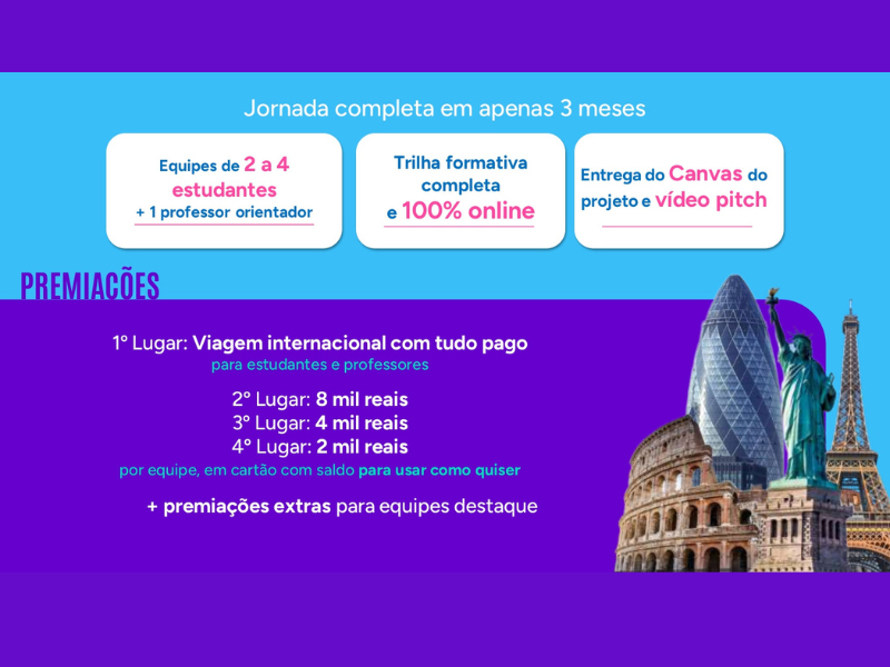 O desafio é colocar suas ideias no papel e montar uma Startup do zero, com o apoio da nossa trilha didática e mentoria pra te dar aquela força!