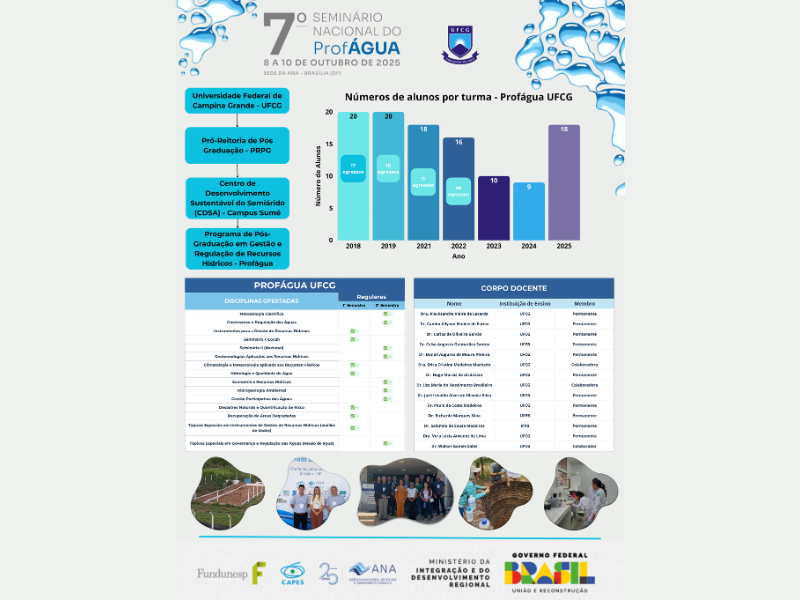 Um grupo de alunos e representantes docentes da Instituição Associada Universidade Federal de Campina Grande (UFCG) está participando do IV Seminário Nacional do ProfÁgua, que acontece desta quarta-feira (5) até a sexta-feira (7), na sede da Agência Nacional de Águas (ANA), em Brasília.